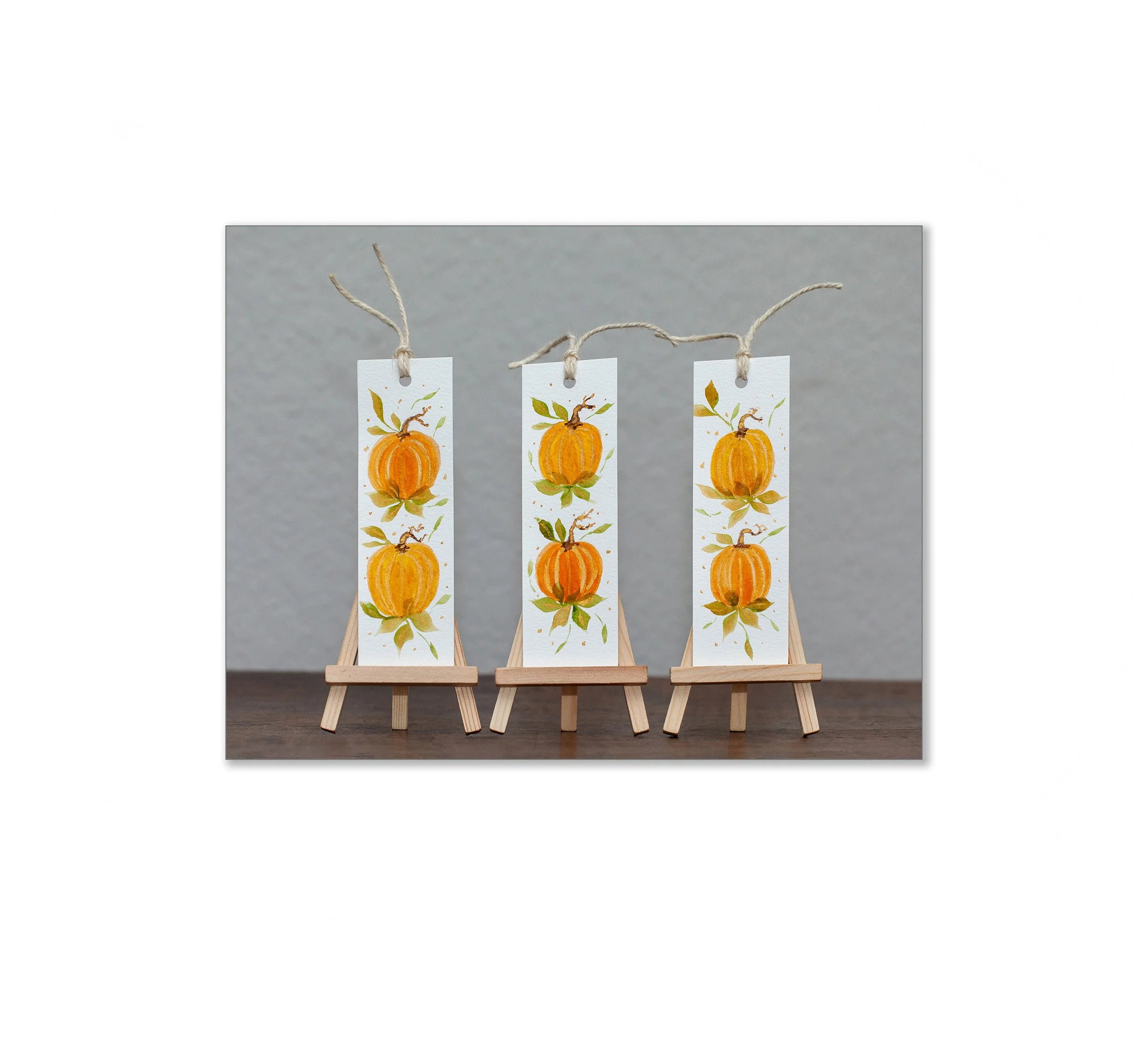 Pumpkin Bookmarks Set One are three bookmarks each painted with two pumpkins and leaves. The design theme is the same. The pumpkins are all painted with various fall colors. Each is accented with gold paint that glistens when you turn the bookmark to the side. These bookmarks are created with 100% cotton watercolor paper. The size is 2” x 6”, which a perfect size for all books. They are sold in a set of three, one design per set. A country style twine is added to the top to indicate where the bookmark is in the book.