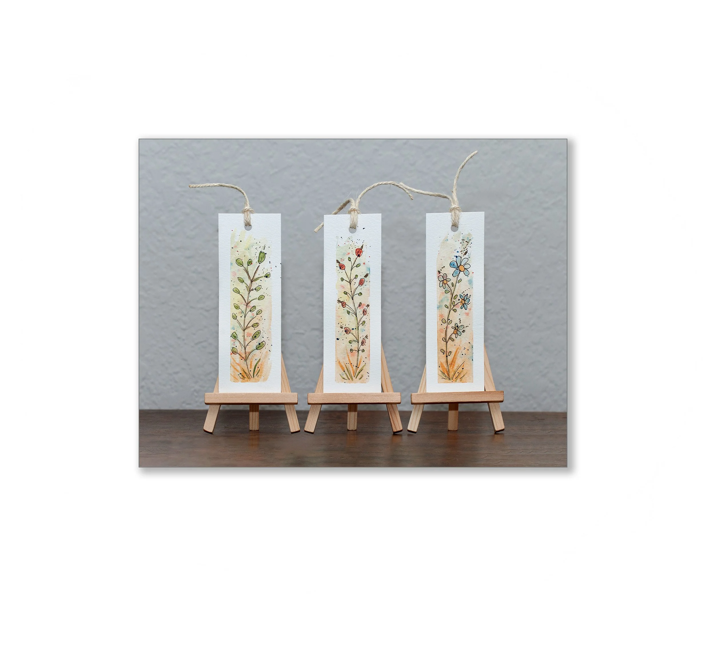 Pumpkin Bookmarks Set Two are three bookmarks each painted with two pumpkins and leaves. The design theme is the same. The pumpkins are all painted with orange fall colors. Each is accented with gold paint that glistens when you turn the bookmark to the side. These bookmarks are created with 100% cotton watercolor paper. The size is 2” x 6”, which a perfect size for all books. They are sold in a set of three, one design per set. A country style twine is added to the top to indicate where the bookmark is in the book.
